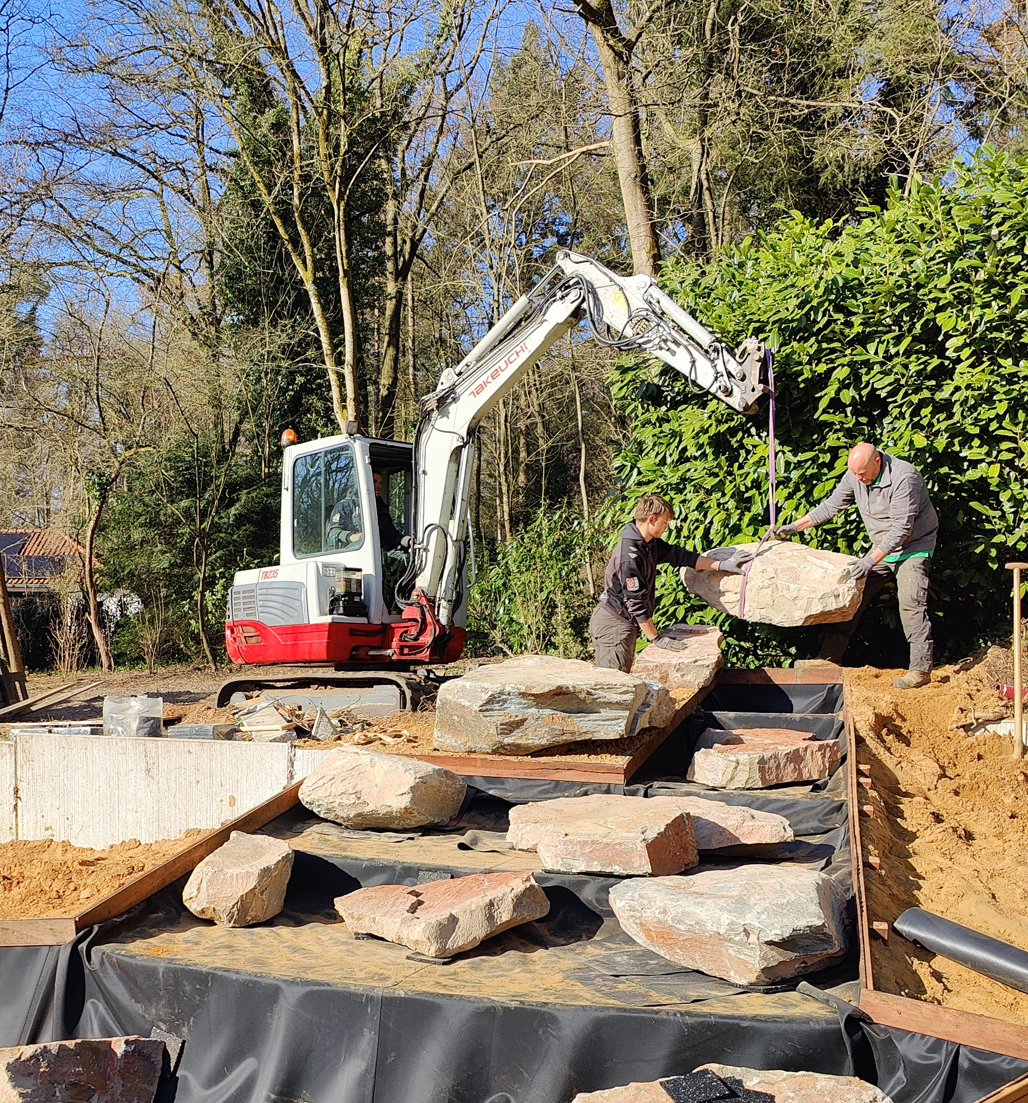 Met enorme stenen wordt de waterval gebouwd.