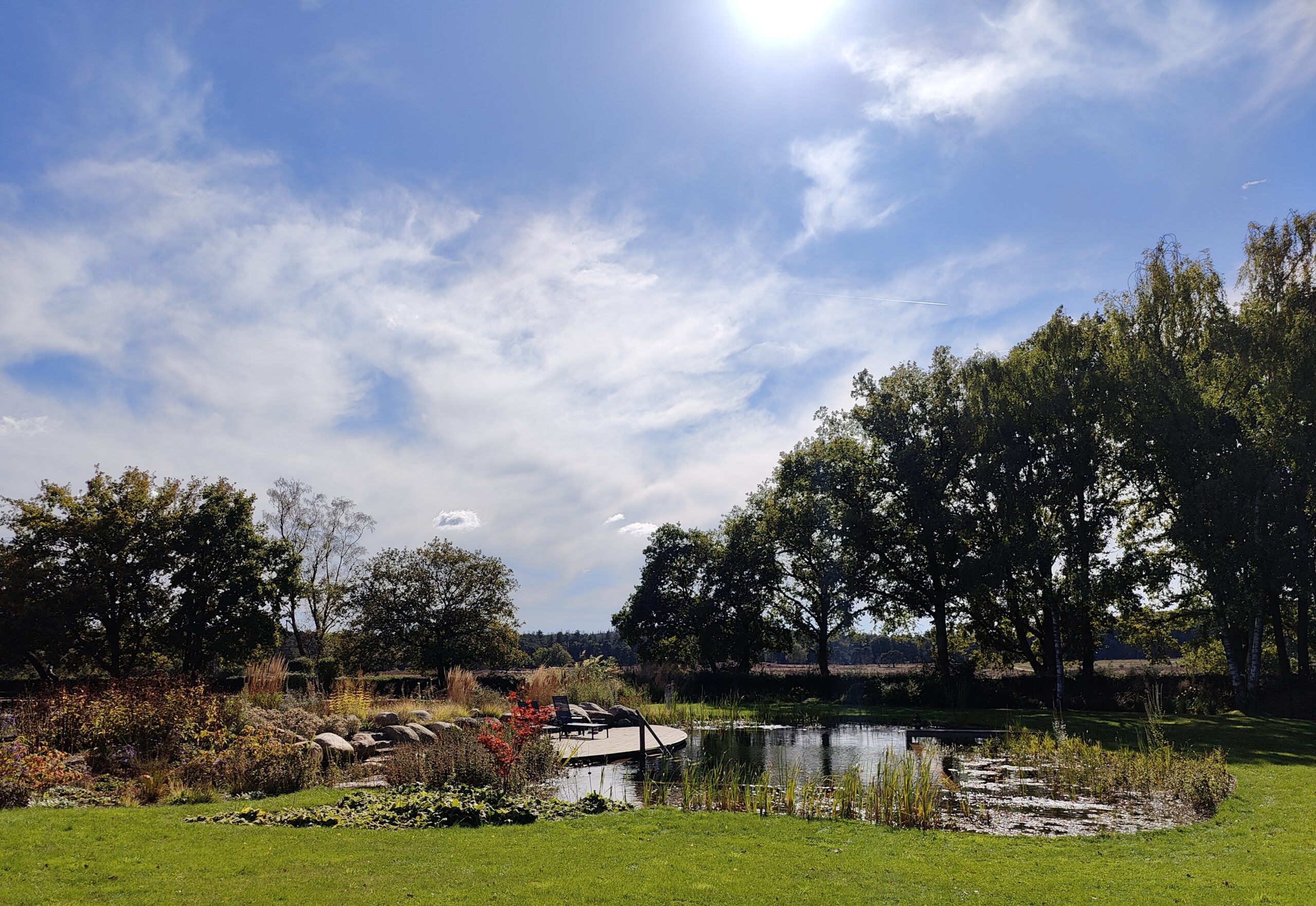 Tussen de weilanden is deze tuin met zwemvijver helemaal af.