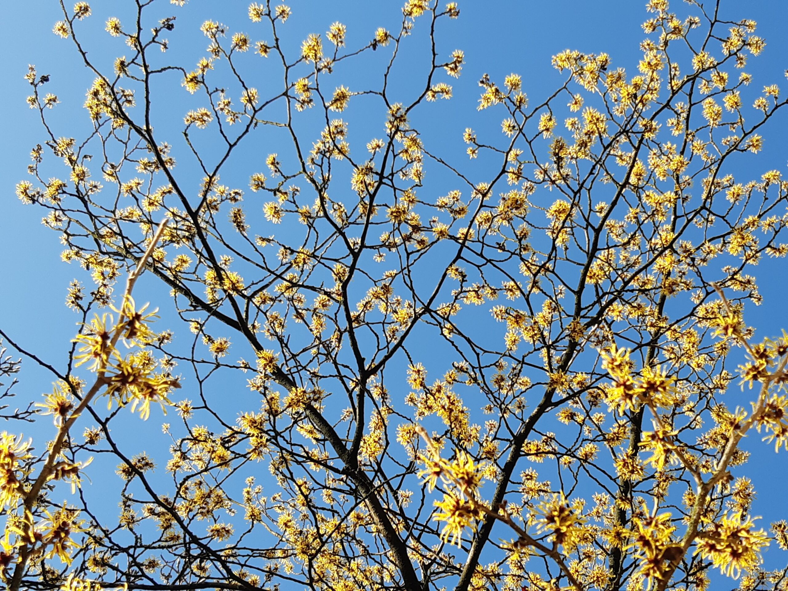 Alhoewel het pas januari is, bloeit de Hamamelis mollis (toverhazelaar) uitbundig.